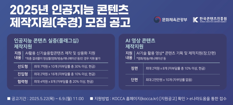 문화체육관광부는 한국콘텐츠진흥원과 함께 2025년 1차 추경으로 편성된 165억 원을 투입하여 인공지능(AI) 기술을 활용해 콘텐츠를 제작하는 기업과 창작자를 육성한다. 이를 위해 5월 22일부터 6월 9일까지 ‘인공지능 콘텐츠 제작 지원 사업’에 참여할 기업과 대학(산학협력단), 공공기관(박물관, 미술관 등) 등을 추가로 공모한다.