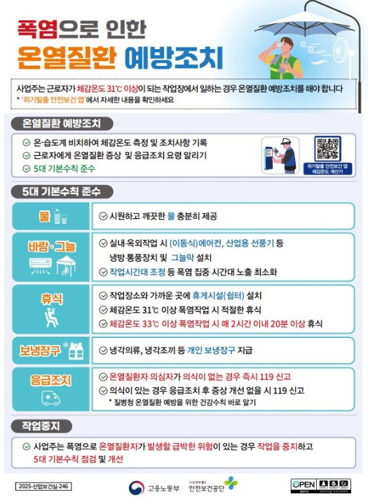 합동점검팀은 17개 언어로 제작한 고용노동부 '폭염안전 5대 기본수칙' 등을 외국인 근로자와 사업주에게 제공하고 현장 적용 여부를 확인한다. 특히, 체감온도 33도 이상 폭염 시 ‘2시간마다 20분 이상의 휴식’ 의무화 등 강화된 작업운영 지침을 적극 설명할 예정이다.