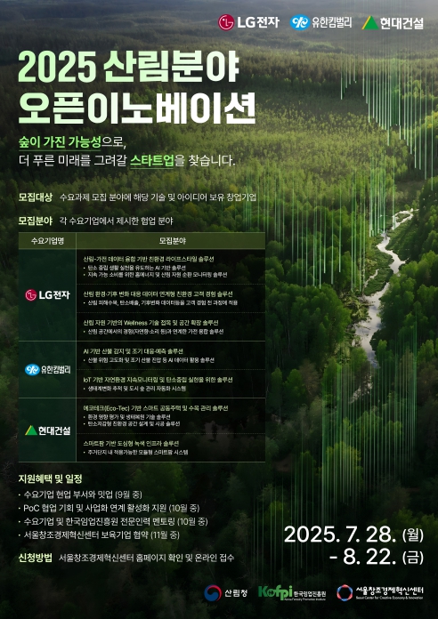 산림청은 오는 7월 28일부터 8월 22일까지 산림 분야 공공데이터와 인공지능(AI) 기술을 활용한 혁신적인 신제품 및 아이디어 상품 개발을 목표로 오픈이노베이션 사업 공모전을 개최한다고 밝혔다.