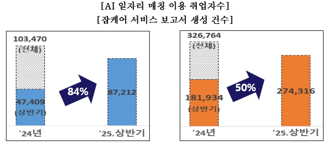 이와 함께 진로탐색, 직업선택, 취업준비를 지원하는 ‘잡케어 서비스’도 이용자가 크게 늘었다. 잡케어는 구직자의 이력서‧자기소개서 등을 AI가 분석해 진로 로드맵, 적합직무, 훈련추천 등을 제공하는 진로상담 도우미로, 특히 청년층의 호응이 컸다. 올해 상반기 잡케어 보고서 생성 건수는 274,316건으로 지난해 같은 기간(181,934건) 대비 50% 증가했으며, 20대 이하 이용자가 90%에 달하는 것으로 나타났다.