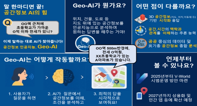 Geo-AI는 공간정보에 특화된 인공지능 기술로서 텍스트 분석을 넘어 공간적(지도·건물·교통 등), 시간적(과거·현재·미래 등) 요소까지 AI가 이해·분석하여 최적의 응답을 제시하며, 챗봇형 AI와는 크게 3가지 차별성이 있다.