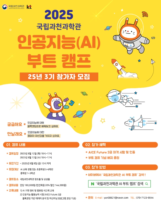 과학기술정보통신부 국립과천과학관은 인공 지능에 대한 학생들의 관심을 유도하고 전문적인 지식 함양의 기회를 제공하기 위해 올해 처음으로 인공지능 관련 프로그램'2025 인공지능 신입 훈련소(부트캠프)'를 개설했다.