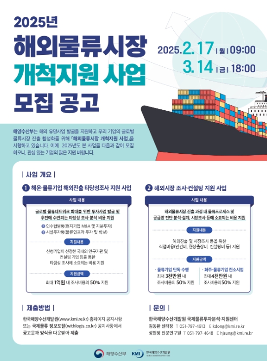 해양수산부는 2월 17일부터 3월 14일까지 '2025 해외물류시장 개척지원 사업'지원대상기업을 모집한다고 밝혔다.