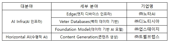 ‘인공지능(AI) 100’에 선정된 국내 인공지능(AI) 창업기업(스타트업)의 지원 내역과 주요 기술을 살펴보면 다음과 같다.