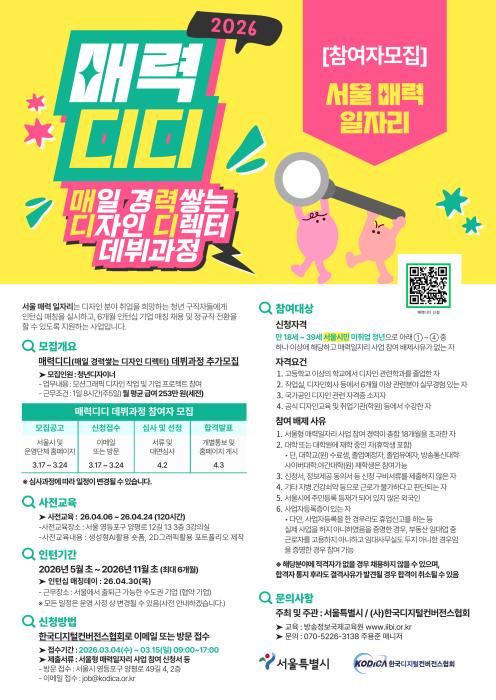 서울 매력일자리 사업은 사전교육(생성형AI교육 포함 120시간) 후 매칭데이를 통해 참여기업에서 6개월간 인턴 근무와 근무 중 직무교육(18시간)을 진행하며, 종료 후에는 취업 연계를 지원한다. 2026년도 '매력디디 데뷔 과정'은 디자인, 모션그래픽 분야 취업을 희망하는 청년을 대상으로 하며, 4월 6일부터 교육을 시작하여 5월부터 6개월간 인턴십을 진행할 예정이다.